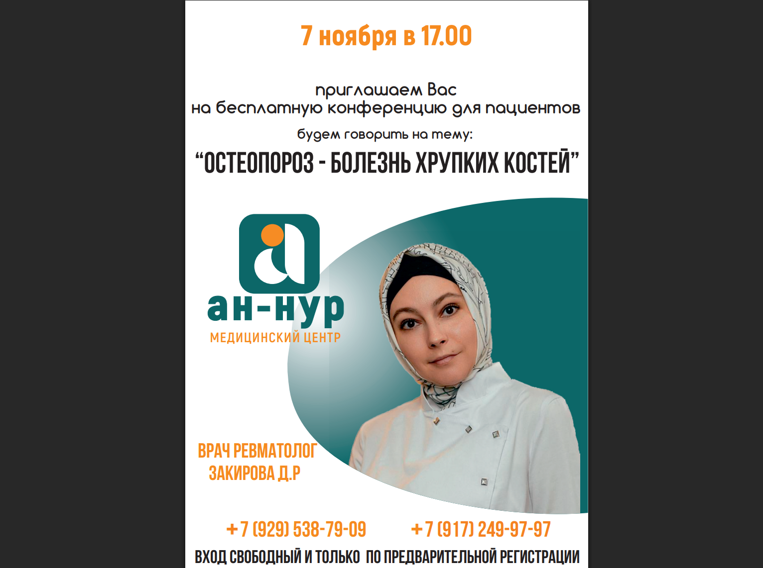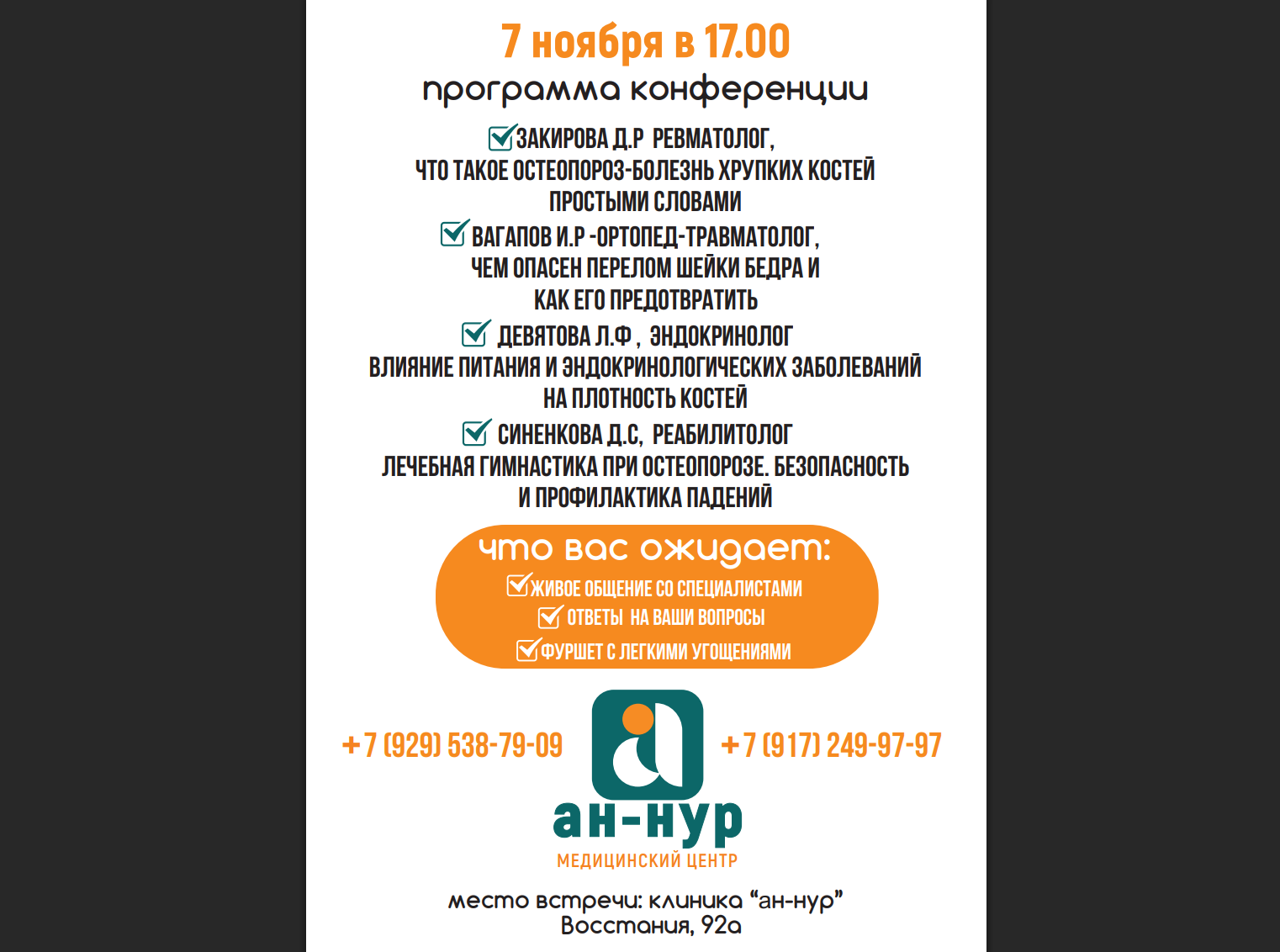 Медицинский центр «АН-НУР» с гордостью представляет уникальную образовательную конференцию для всех, кто заботится о здоровье своих костей. Мероприятие проводится при поддержке ведущих специалистов в области ревматологии, травматологии и эндокринологии.